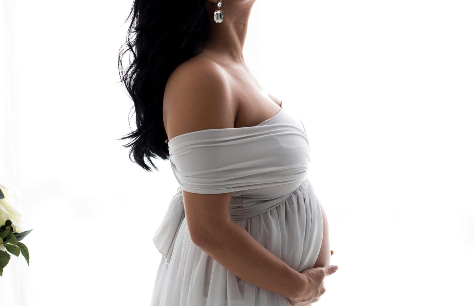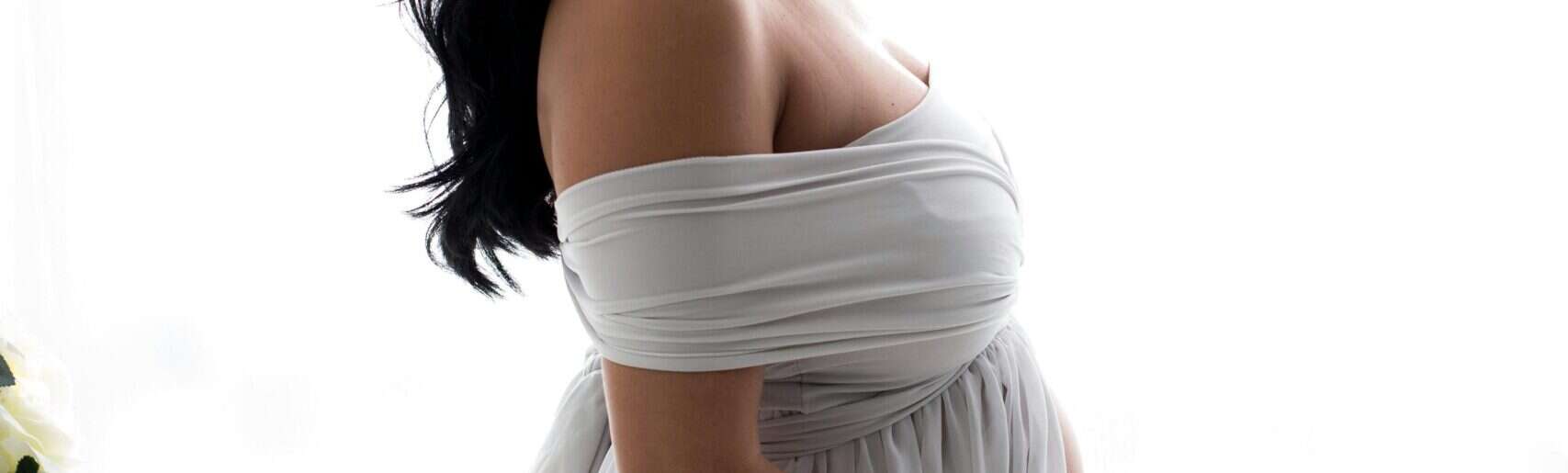 Form-fitting dresses are perfect for showing off your baby bump. These dresses hug your curves in all the right places, highlighting the beauty of your pregnancy. This is precisely the goal for your maternity boudoir session. There are also form fitting dresses that are tight around your torso but loose at the bottom and have flowing tails. That style photographs beautifully. I recommend choosing materials like lace or sheer fabrics that add a touch of elegance and femininity.